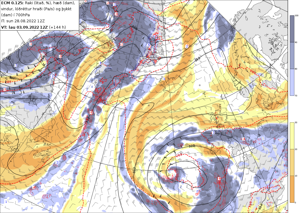 Síðasta spákortið, einnig frá ECMWF sýnir hve hæðarhryggurinn úr suðvestri og hér austur yfir landið, veldur niðurstreymi samfara langþráðri hæðarsveigju í vindasviðinu. Þar með þurrt loft yfir landinu á laugardag (3. sept). Gefur vonir um sól í sinni😊