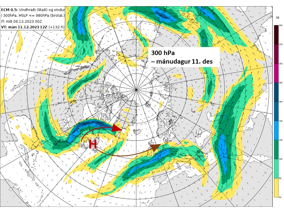 breytingar og eins og oftast eiga þær rót sína í fjarska. Hálftakortið í 300 hPa gildir á mánudag. Þá spáir Evrópska reiknimiðstöðin að álitleg