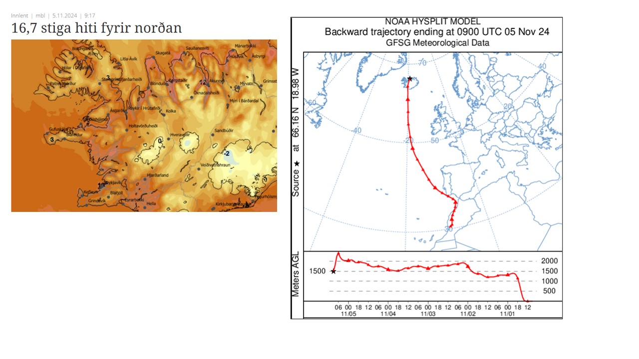 Með einföldum HYSPLT-bakreikningi lofts kl. 9 í 1.500 metra hæð yfir utanverðum Tröllaskaga sést að upruni þess má rekja allt suður til N-Afríku, nánar tiltekið til Marrakó. Þar var þa' á laugardag, um 15°C í þessari sömu hæð og trúlega um 25°C við yfirborð í skini sólar. Á leið sinni hingað norður eftir, hefur það samt ekki kólnað nema um 5 stig (úr 15 í 10°C í 1.500 m hæð).