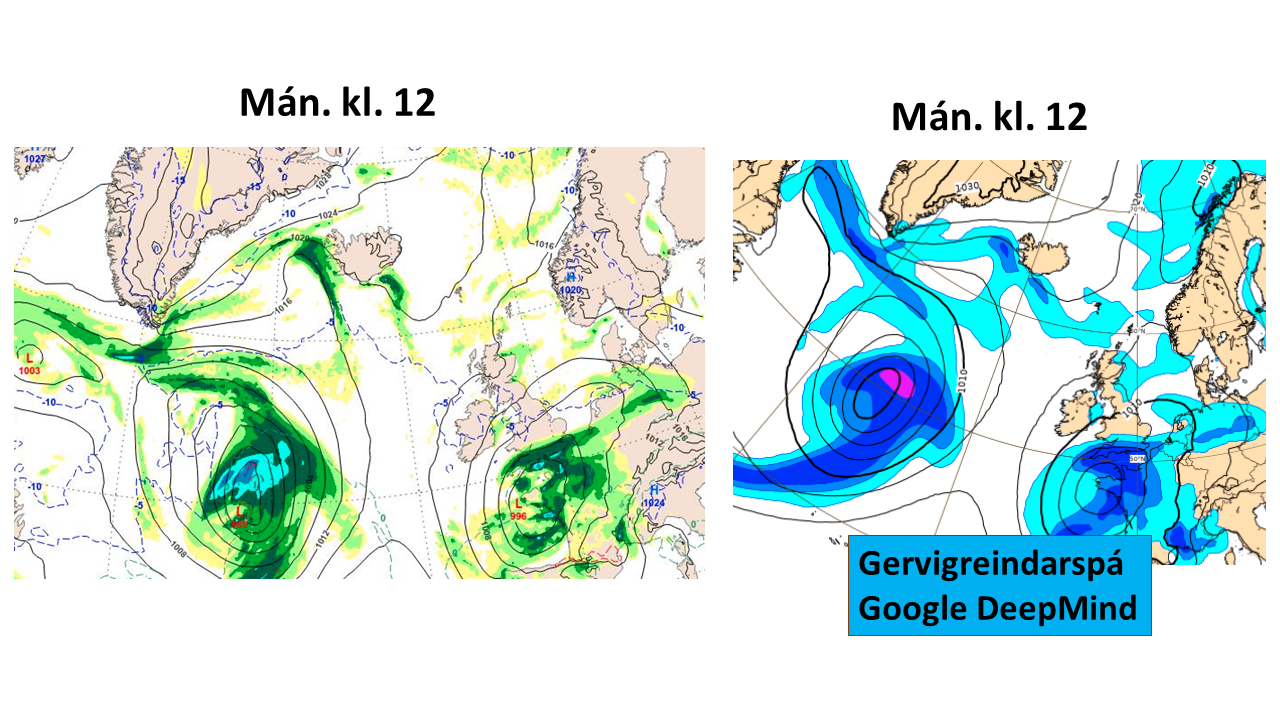 Athyglisvert er að bera saman gervigreindarspá (Gg) Google á mánudag, en hana má finna má á spávef Evrópsku reiknimiðstöðvarinnar ásamt þremur öðrum slíkum tólum. Gg-spáin er ekki ósvipuð þeirri reiknuðu skref fyrir skref. Fróðlegt að sjá hvor verður nærri raunveruleikanum þegar upp er staðið.