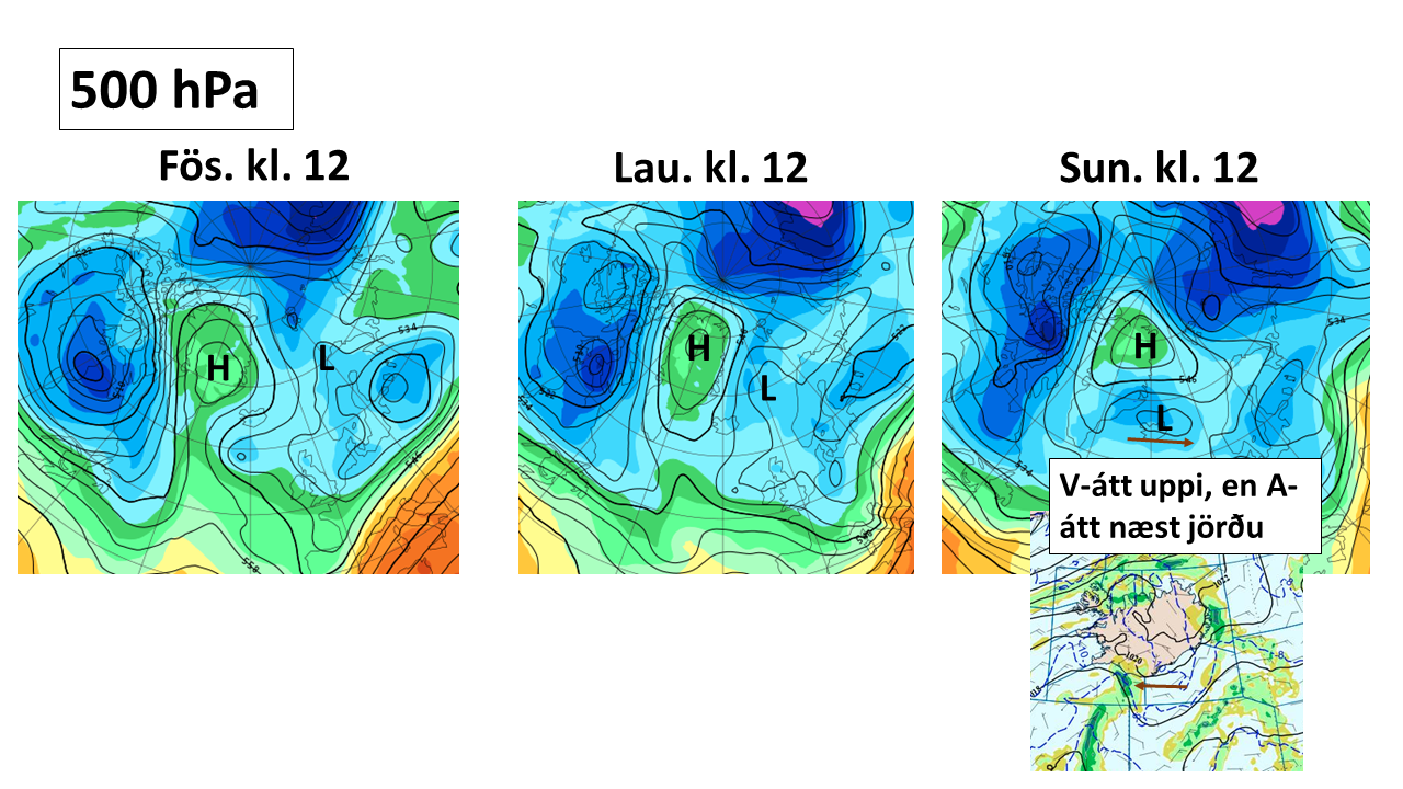 meðan spá er V-átt í 5 km hæð, blæs af A nær jörðu. Svo