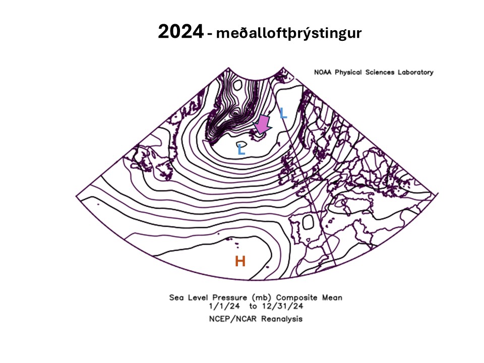 2024 voru meðallægðirnar tvær, önnur skammt suðvestur undan og hin fyrir norðaustan land. Að jafnaði var þrýstifar sem leiddi af sér tíðan N- og NA-stæðan vind.