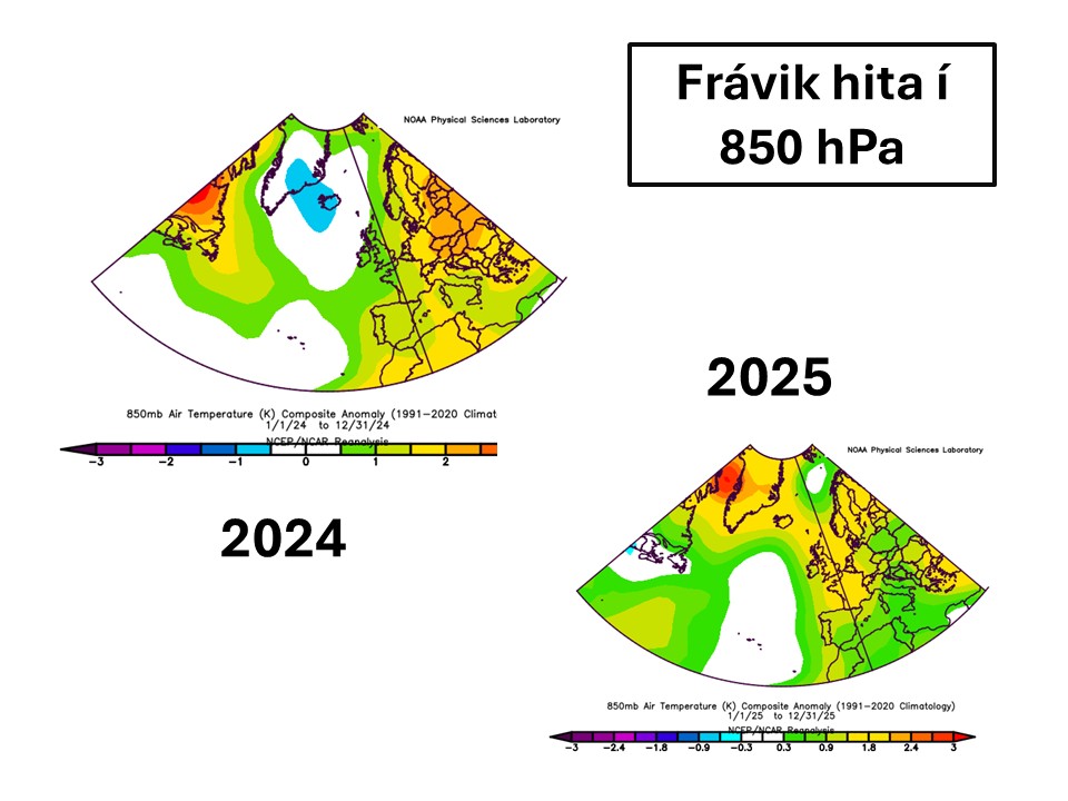 Síðasta myndin sýnir síðan frávik hita þessi sömu ár í 850 hPa fletinum (um 1.250 m). Annars vegar (2024) neikvæð frávik um 1 stig og hins vegar (2025) jákvæð frávik upp á um 1,5 stig. Þau frávik dugðu í hitamet árshitans á landsvísu.