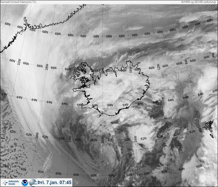 Á þessari fínu tunglmynd frá kl. 07:45 sjáum við skýjakerfin. Vek athygli á skarpa flókanum í vestri. Þetta eru afturbeygðu skil lægðarinnar sem hem hún hringar um sig. Á ensku kallast þau "sting jet", en ekkert þjált íslenskt orð er til um þetta fyrirbæri. Í háloftunum er milt og rakt loft komið umhverfis lægðarmiðjuna og á sama tíma er kalt loft úr vestri að troðast inn undir þennan bakka. Fyrir vikið eykst hitamunur og þar með þrýstistigull til suðurs.