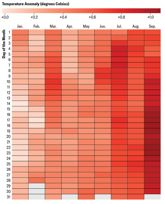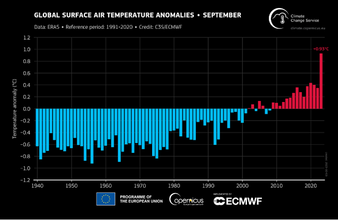 Septemberhitinn reyndist að jafnaði 1,40°C hærri en meðaltalið 1850-1900 sem að Bretar er kalla "preindustrial average".