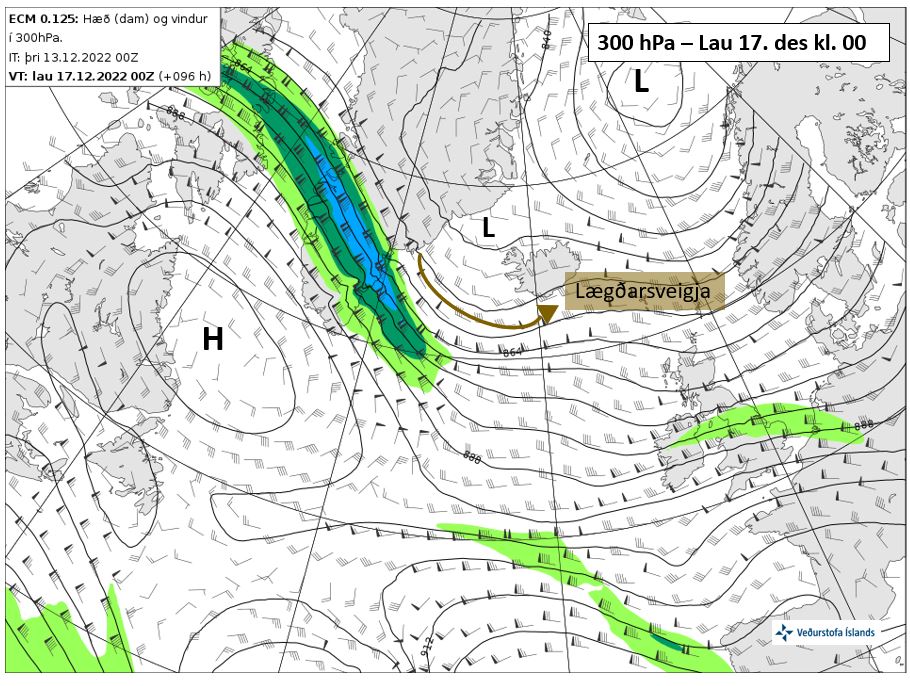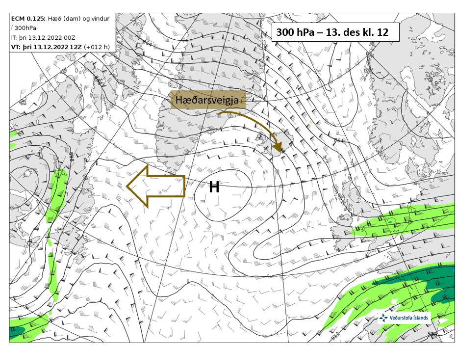 Lítum betur á breytingarnar sem við eigum í vændum. Fyrst kort af stöðu mála upp í um 9 km hæð í 300 hPa þrýstifletinum úr spám ECMWF af Brunni Veðurstofunnar. Hæðin sem mjög hefur komið við sögu að undanförnu suðvestur af landinu, NV-átt í hæð hér yfir og áberandi hæðarsveigja í straumnum. Tryggir niðurstreymi loft og þar með bjartviðri. Ekkert sér til kuldans á þessu korti í neðri lögum með A-Grænlandi og stefnir hingað.
